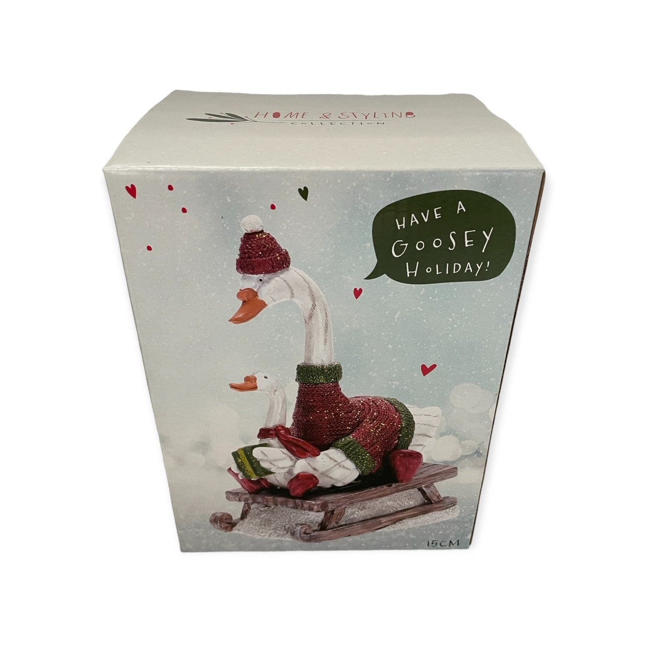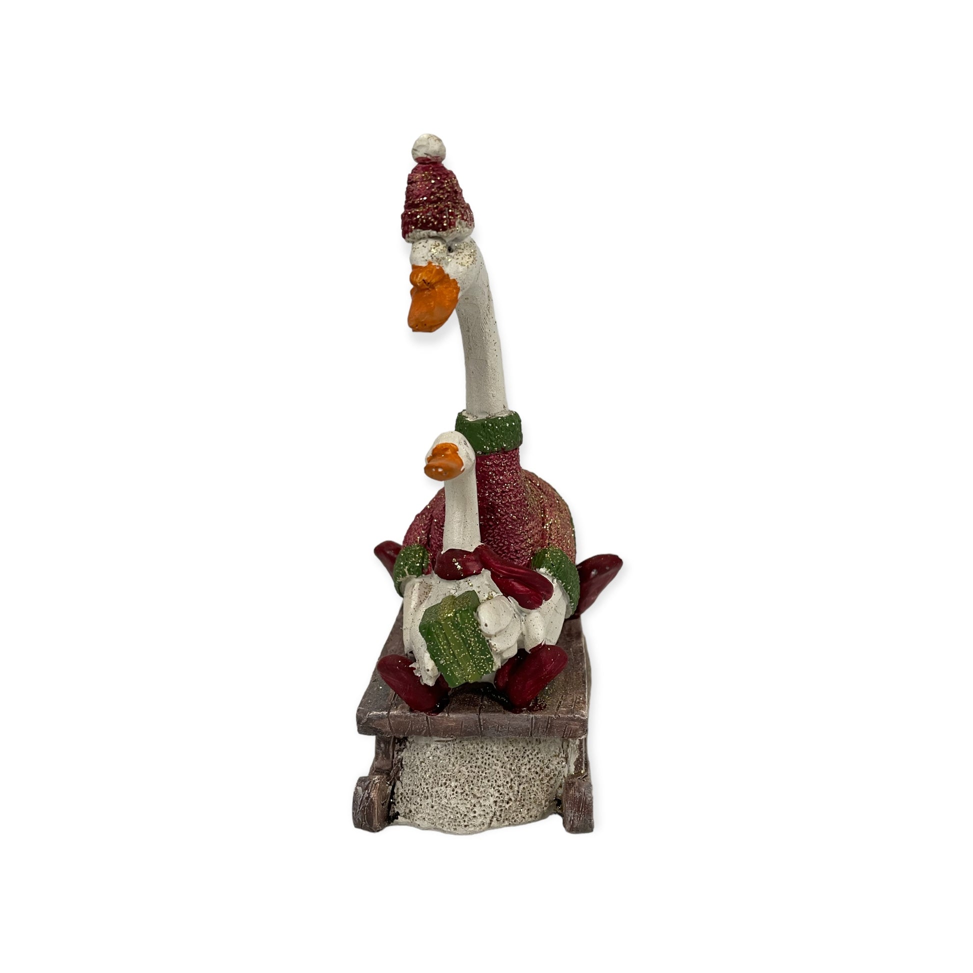 Eine Winterlandschaft, die garantiert ein Lächeln zaubert! Diese fröhliche Figur zeigt Mutter Gans und ihr Küken in Weihnachtsstimmung, gemütlich auf einem Schlitten sitzend. Mit warmen Schals, festlichen Farben und einem Geschenk im Flügel bringen sie sofort Weihnachtsstimmung in Ihr Zuhause.