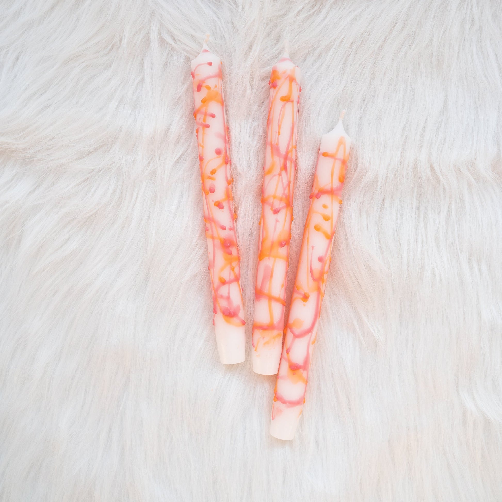 Deze vrolijke handgedipte Dip Dye kaarsen in wit, roze en oranje brengen instant kleur en sfeer in elke ruimte. Elke kaars is met de hand gedipt, waardoor geen enkele set precies hetzelfde is — dat maakt ze juist zo charmant en ambachtelijk.