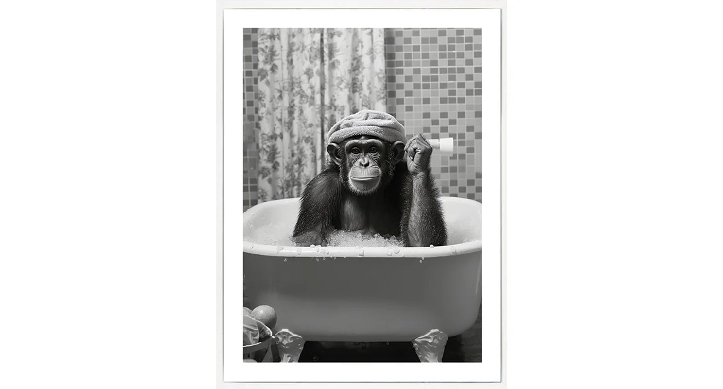 Monkey in the bath wall art – black and white art print in a white frame – 45 × 60 cm