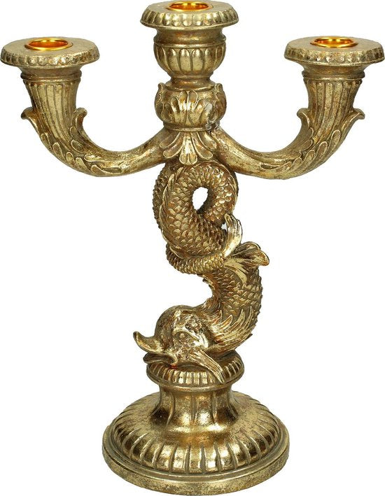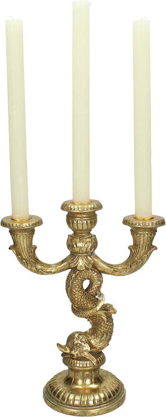 Creëer een elegante en sfeervolle setting met deze unieke visvormige kandelaar in goudkleur. De drie armen bieden ruimte voor stijlvolle dinerkaarsen, terwijl de gedetailleerde afwerking met schubben en vinnen zorgt voor een artistiek accent in elk interieur.