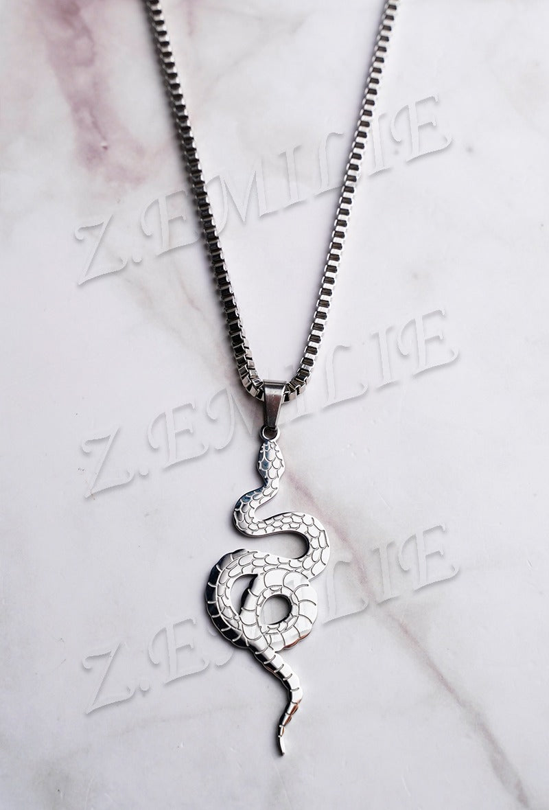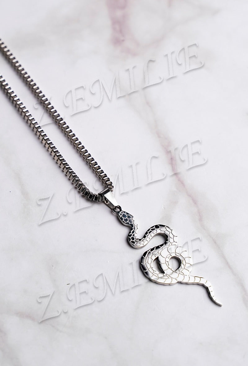 Deze zilverkleurige slangenketting is een stijlvolle blikvanger voor iedereen die houdt van krachtige sieraden met een symbolische twist. De gedetailleerde slanghanger straalt mystiek en elegantie uit, terwijl de glanzende ketting van stainless steel zorgt voor een moderne, tijdloze look.