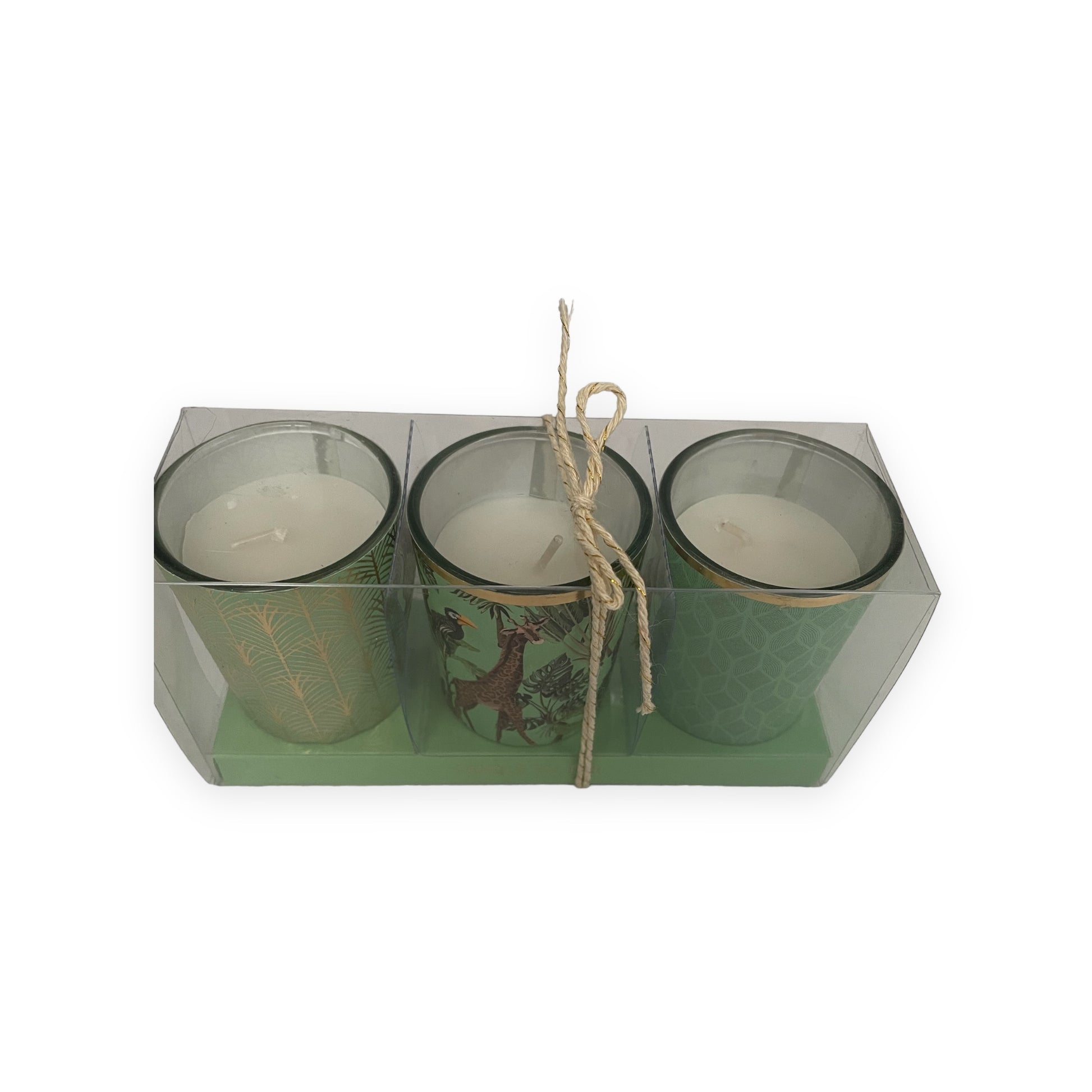 Set van 3 Kaarsglaasjes – Groen met Giraffe & Goud (Ø 5 × 6,5 cm)