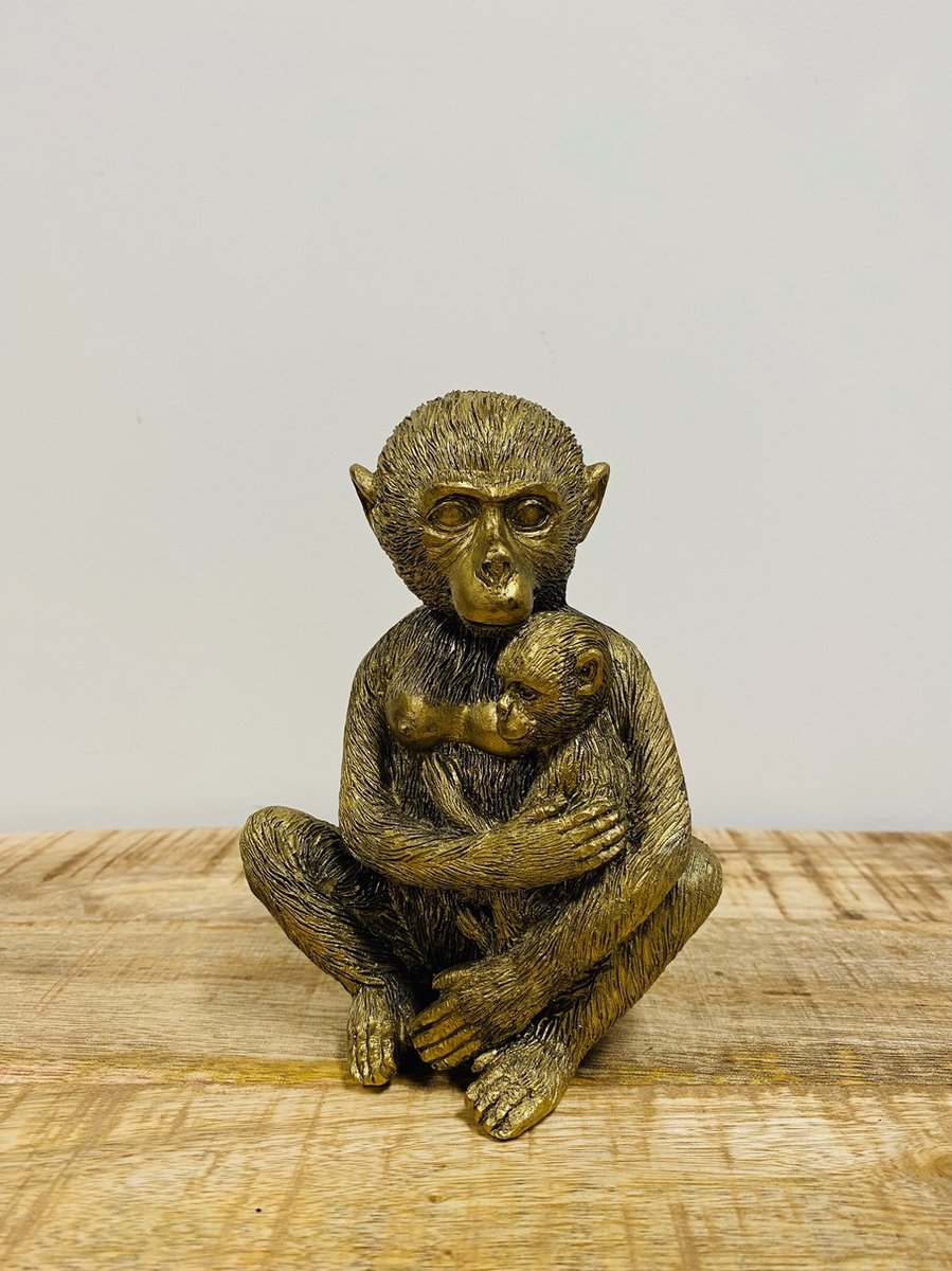 Voeg een liefdevol en stijlvol accent toe aan je interieur met dit prachtige gouden beeld van een aap met haar jong. Mama aap zit rustig en beschermend, terwijl het kleine baby-aapje veilig tegen haar aan leunt. Dit beeld straalt warmte, geborgenheid en elegantie uit.