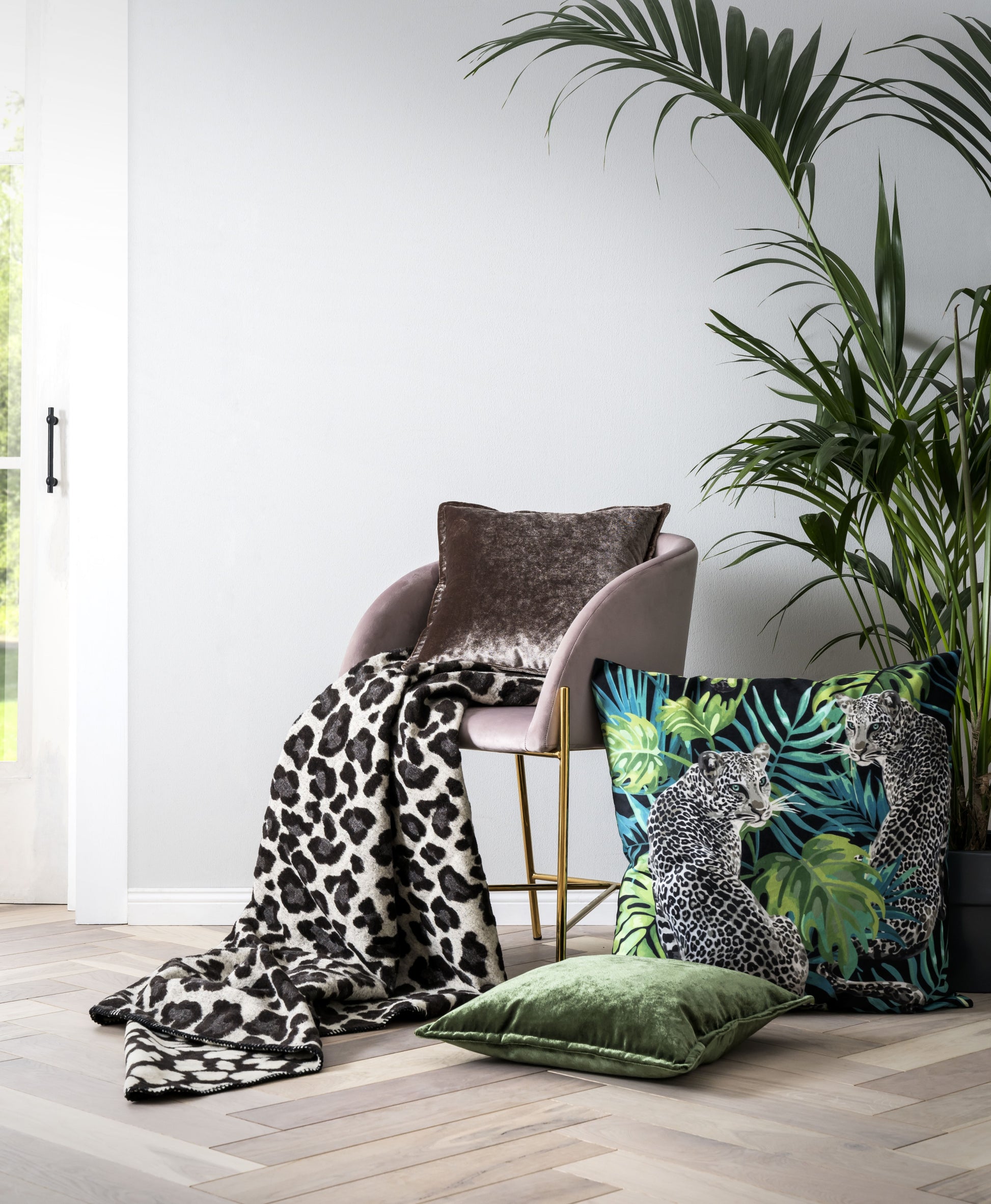 - Drapeer de deken over een fluwelen fauteuil of combineer met kussens in panter- of tijgerprint voor een jungle chique sfeer