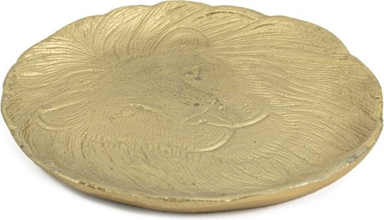 Breng een vleugje elegantie naar je interieur met dit goudkleurige metalen schaaltje in de vorm van een leeuwenkop. Ideaal voor het presenteren van een amberblokje, maar ook prachtig als decoratief item op zich. De gedetailleerde manen en de chique gouden finish maken dit schaaltje tot een subtiele eyecatcher.