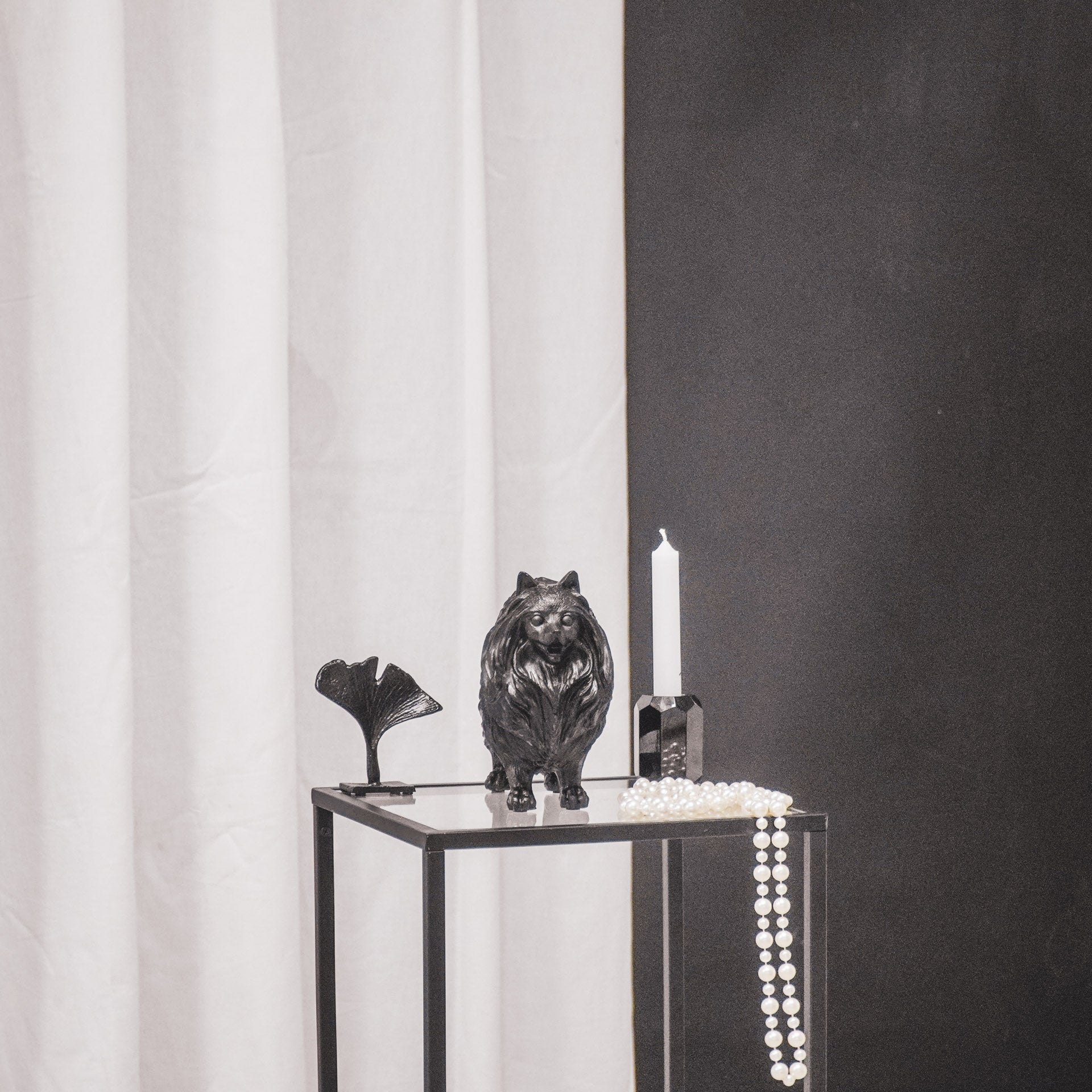 Dit zwarte Pomeriaan beeld is een stijlvolle ode aan een geliefd hondenras. Met zijn glanzende afwerking, verfijnde vachtstructuur en trotse houding is dit beeld zowel charmant als chic. Een echte eyecatcher voor dressoirs, kasten of als statement op je salontafel.