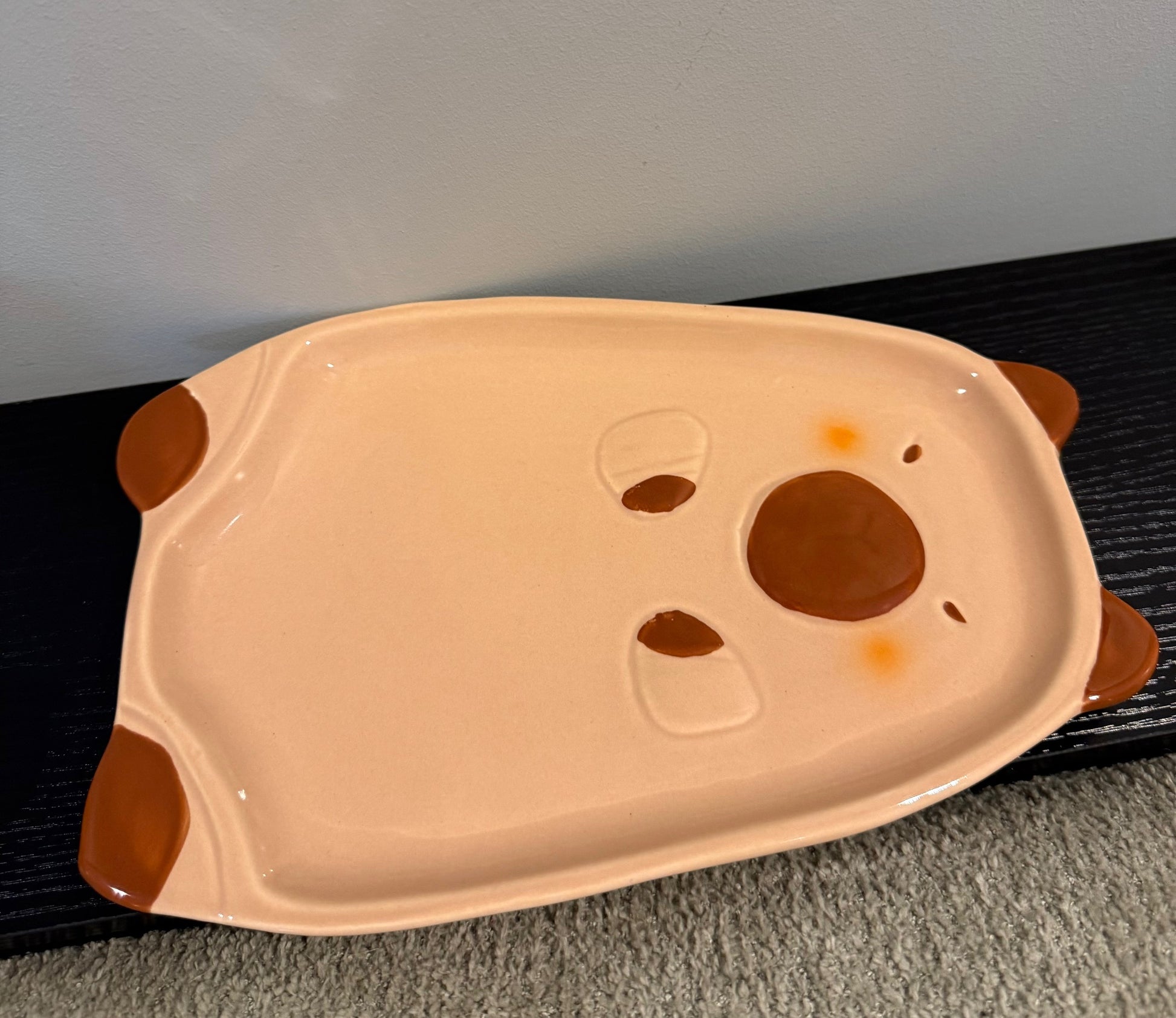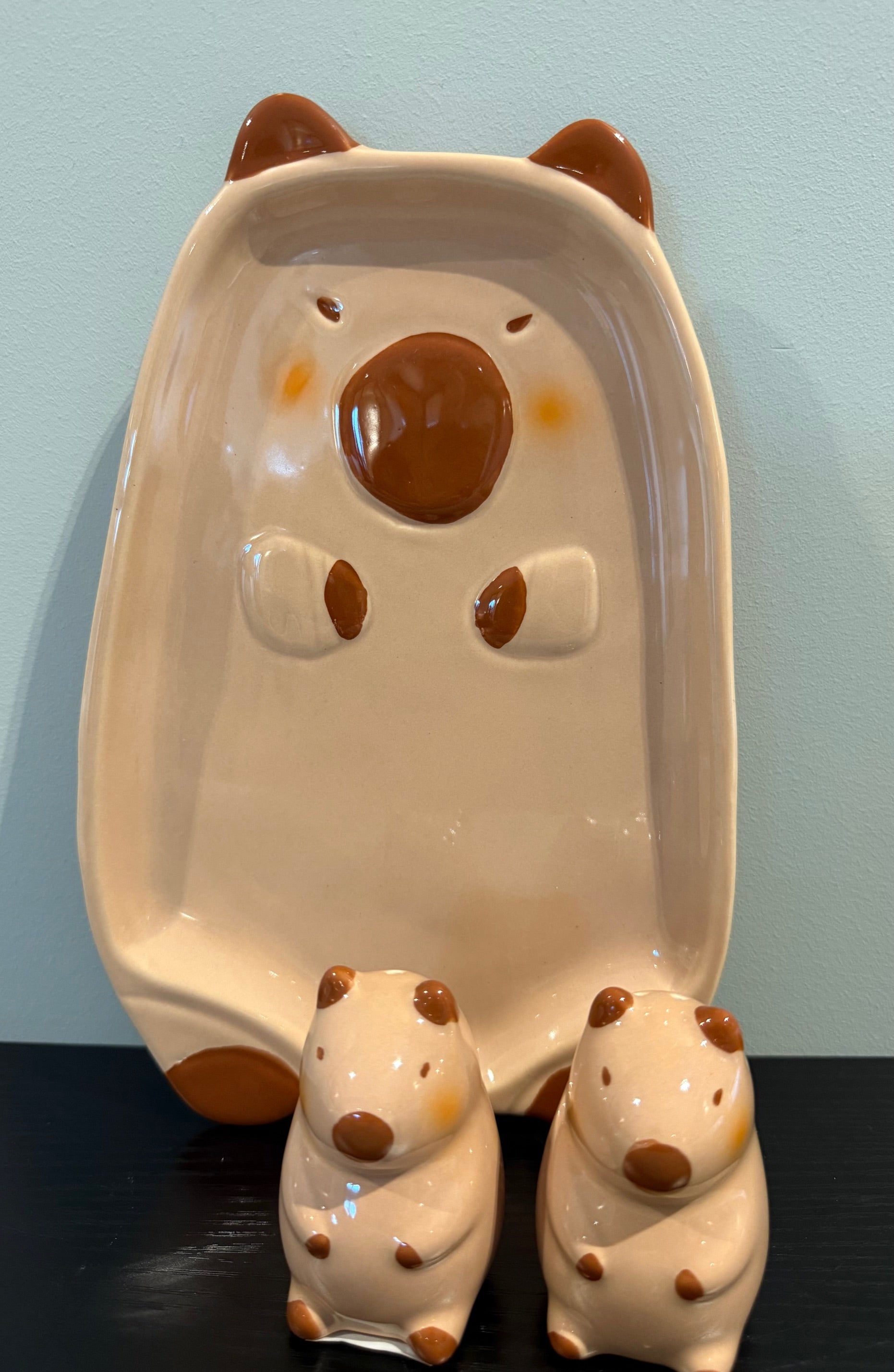 Capibara cuteness op z’n best! Deze keramieken serveerschaal in de vorm van een capibara is perfect voor koekjes, snacks of als opvallend decoratie-item. Met z’n guitige snoet, warme kleur en 3D-details brengt deze schaal een glimlach op elke tafel of plank.