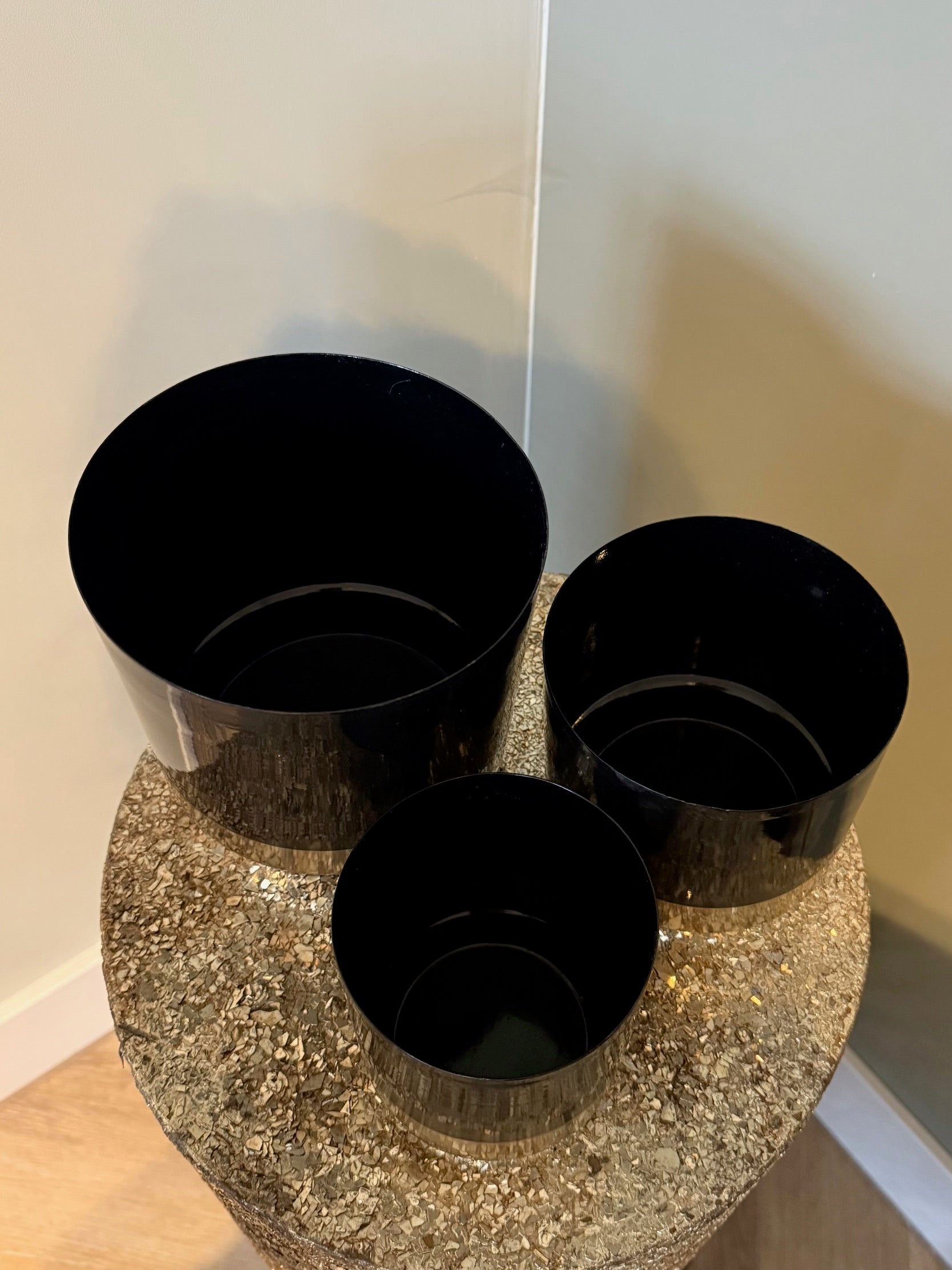 Deze chique set zwarte decoratiepotten met gouden onderrand is een stijlvolle toevoeging aan elk interieur. Het glanzende metaal en de strakke vormgeving geven jouw woonruimte direct een luxe, moderne uitstraling. Perfect voor planten, droogbloemen of als decoratief object op zichzelf.